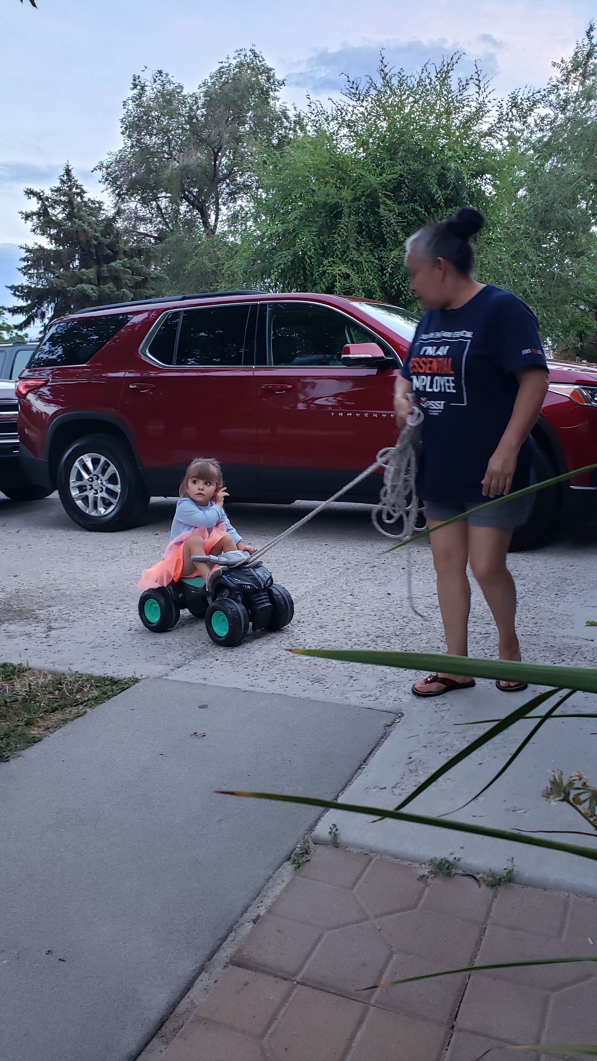 Lilah helping grandma water the grass in her new skirt.